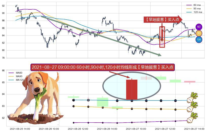 形态多维评估: ⚀ 2021-08-27 09:00:00小时显现 60小时-90小时-120小时均线 【旱地拔葱】买入点 看多信号,后市看涨,买入
