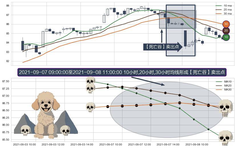 形态多维评估: ⚀ 2021-09-07 10:00:00-小时至2021-09-08 11:00:00-小时显现 10小时-20小时-30小时均线 【死亡谷】卖出点 看空信号,后市看跌,卖出