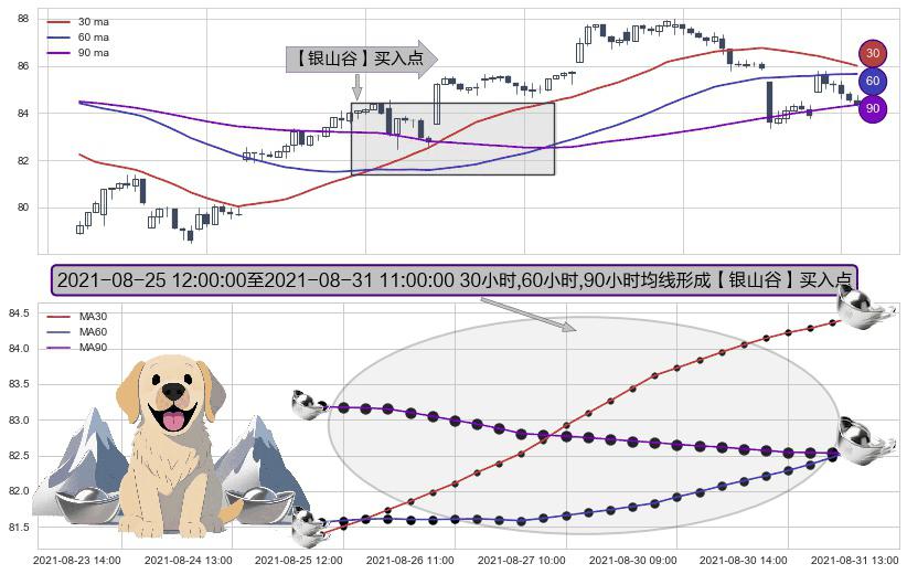 形态多维评估: ⚀ 2021-08-25 13:00:00-小时至2021-08-31 11:00:00-小时显现 30小时-60小时-90小时均线 【银山谷】买入点 看多信号,后市看涨,买入