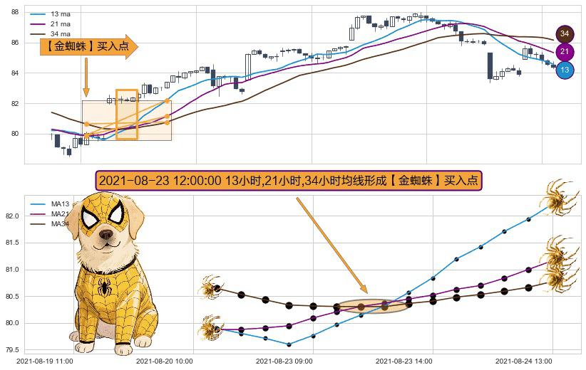 形态多维评估: ⚀ 2021-08-23 12:00:00小时显现 13小时-21小时-34小时均线 【金蜘蛛】买入点 看多信号,后市看涨,买入
