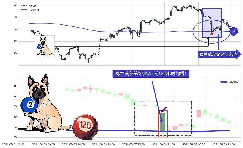 形态多维评估: ⚀ 2021-09-08 09:00:00-小时显现 葛兰威尔均线 120小时均线 第②买入点 上升趋势的中继信号,后市看涨,买进信号