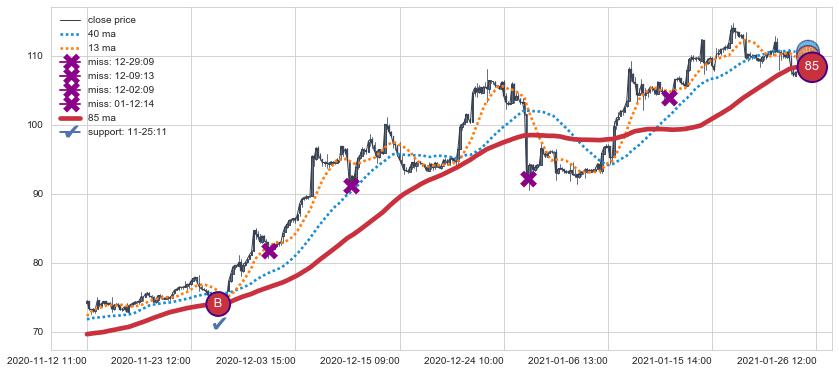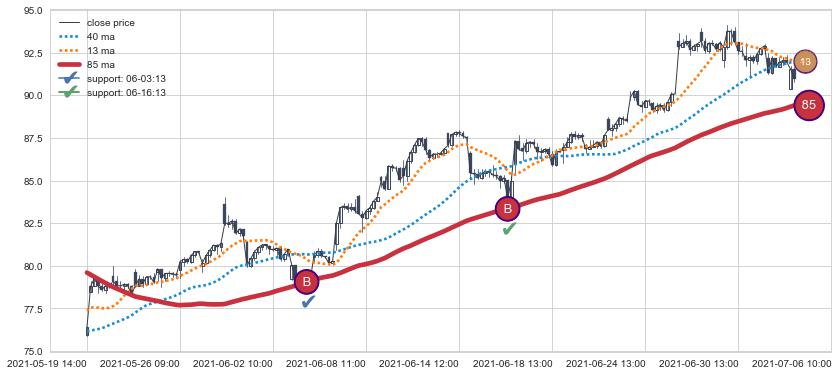 上涨趋势05-19 14:00-07-06 10:00,均线85确认关键支撑2处