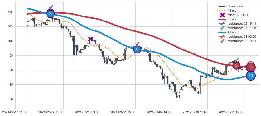 下跌趋势02-17 12:00-03-12 14:00,均线40, 85确认关键阻力3处