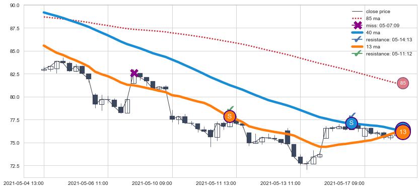 下跌趋势05-04 13:00-05-17 14:00,均线40, 13确认关键阻力2处