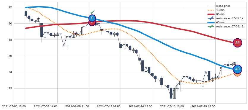 下跌趋势07-06 10:00-07-20 13:00,均线40, 85确认关键阻力1处