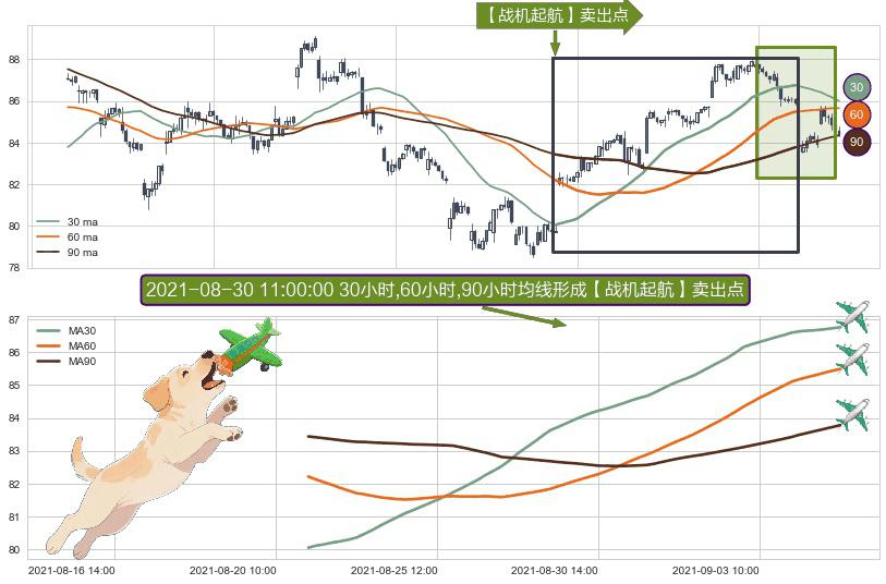 形态多维评估: ⚀ 2021-08-20 14:00:00小时-2021-09-07 14:00:00小时显现 30小时-60小时-90小时均线 【战机起航】卖出点 看空信号,后市看跌,卖出