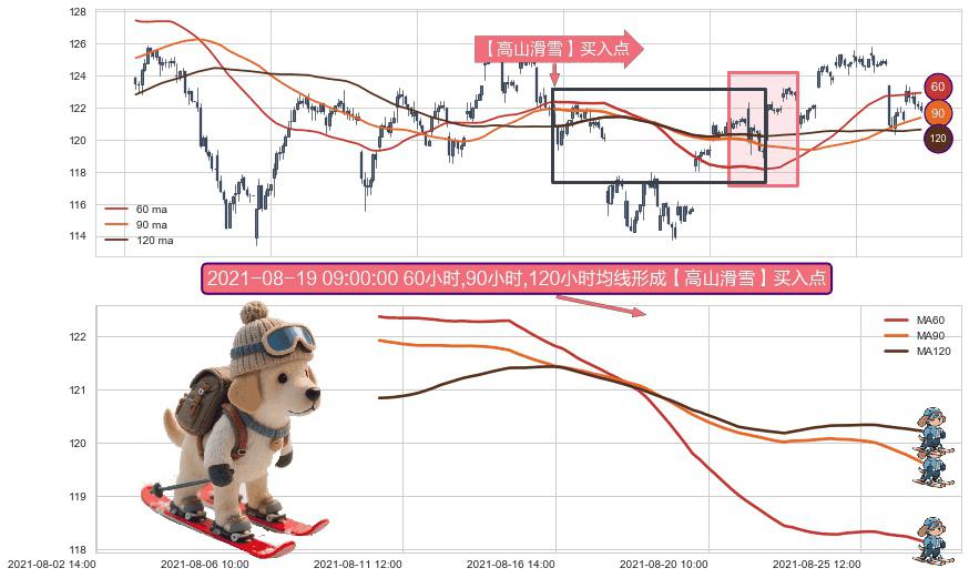⚀ 2021-08-11 09:00:00小时-2021-08-26 14:00:00小时显现 60小时-90小时-120小时均线 【高山滑雪】买入点 看多信号,后市看涨,买入