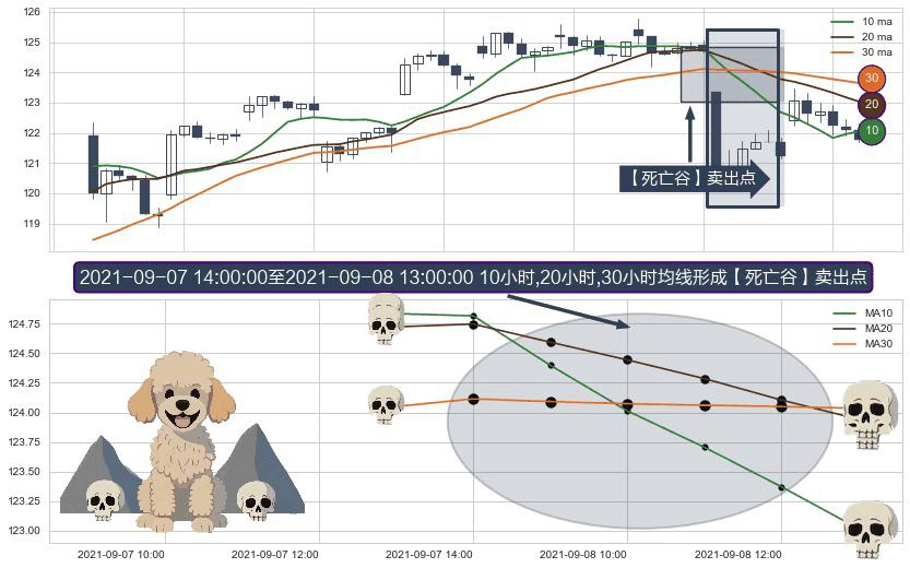 ⚀ 2021-09-08 09:00:00-小时至2021-09-08 13:00:00-小时显现 10小时-20小时-30小时均线 【死亡谷】卖出点 看空信号,后市看跌,卖出