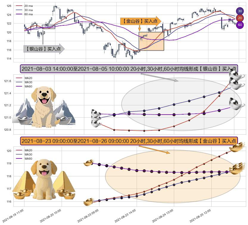 ⚀ 2021-08-23 10:00:00-小时至2021-08-26 09:00:00-小时显现 20小时-30小时-60小时均线 【金山谷】买入点 其再次确认了买入信号,可靠性更强,买入