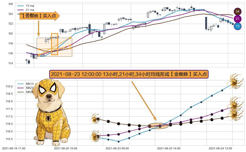 ⚀ 2021-08-23 12:00:00小时显现 13小时-21小时-34小时均线 【金蜘蛛】买入点 看多信号,后市看涨,买入