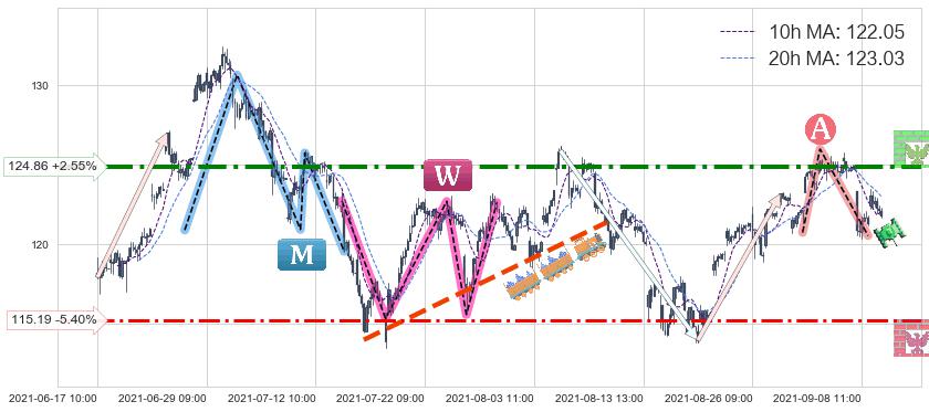 ♘ 阻力价格位124.86,可信任强度82.74%,距离最后交易2021-09-09 14:00形成的收盘价格121.76相差 +2.55%