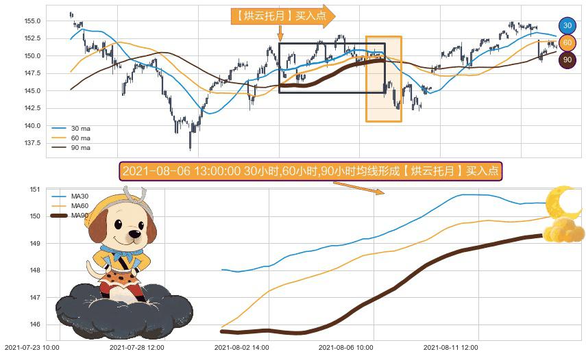 形态多维评估: ⚀ 2021-07-30 11:00:00小时-2021-08-16 09:00:00小时显现 30小时-60小时-90小时均线 【烘云托月】买入点 看多信号,后市看涨,买入