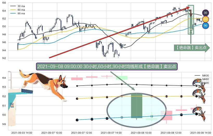 形态多维评估: ⚀ 2021-09-08 09:00:00小时显现 30小时-60小时-90小时均线 【绝命跳】卖出点 看空信号,后市看跌,卖出