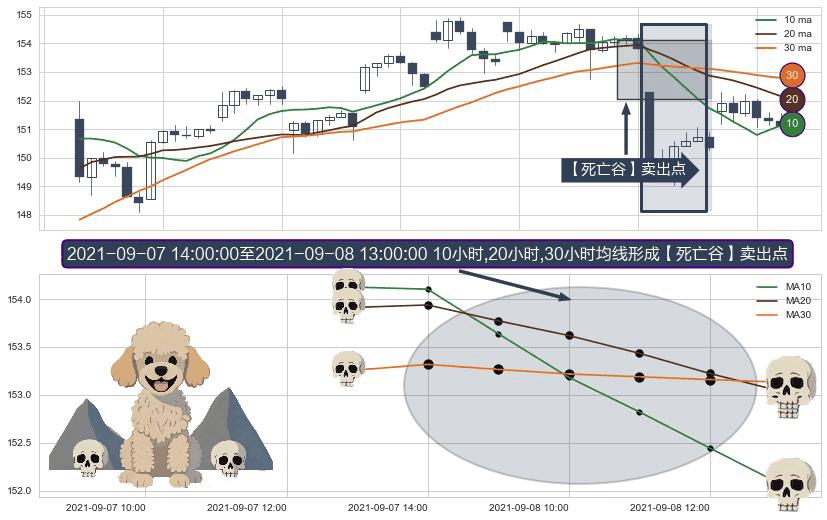 形态多维评估: ⚀ 2021-09-08 09:00:00-小时至2021-09-08 13:00:00-小时显现 10小时-20小时-30小时均线 【死亡谷】卖出点 看空信号,后市看跌,卖出