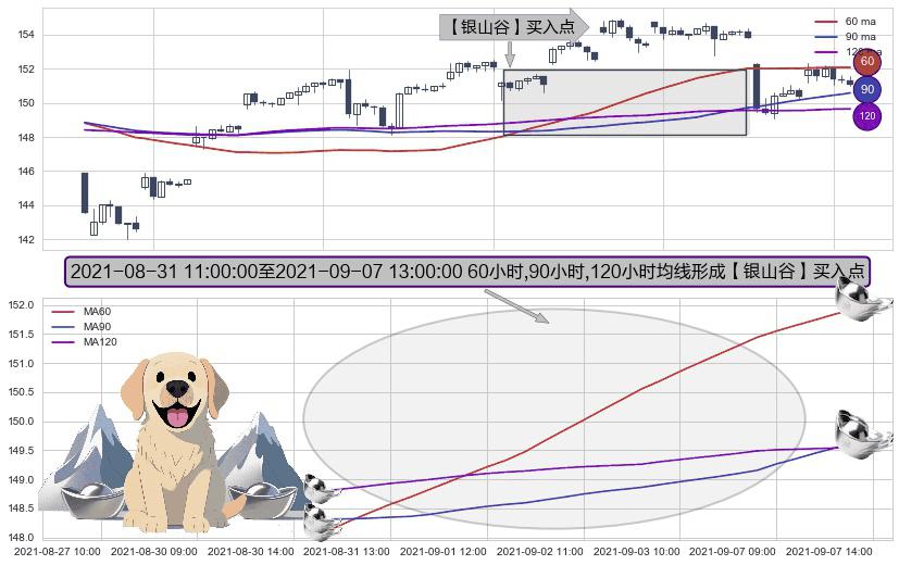 形态多维评估: ⚀ 2021-08-31 12:00:00-小时至2021-09-07 13:00:00-小时显现 60小时-90小时-120小时均线 【银山谷】买入点 看多信号,后市看涨,买入