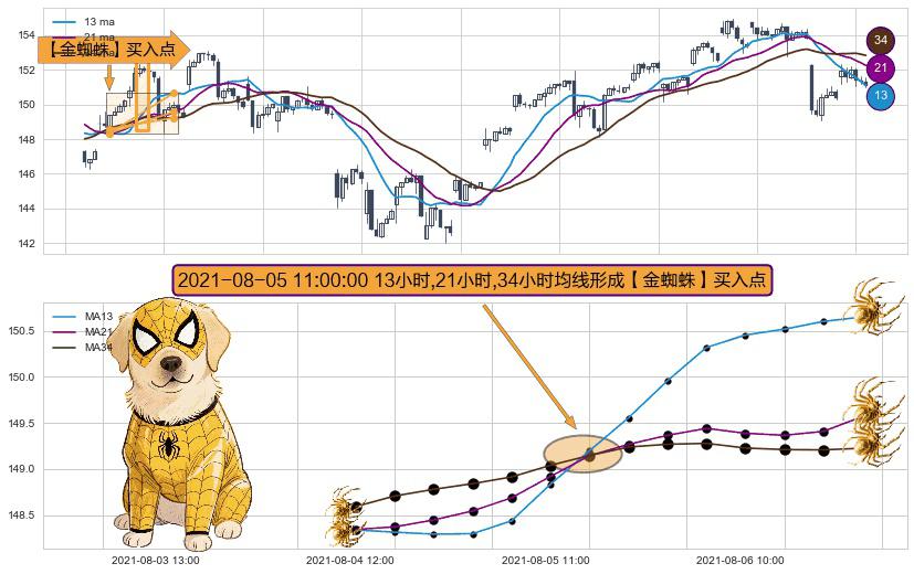 形态多维评估: ⚀ 2021-08-05 11:00:00小时显现 13小时-21小时-34小时均线 【金蜘蛛】买入点 看多信号,后市看涨,买入