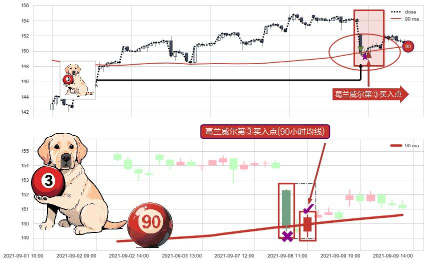 形态多维评估: ⚀ 2021-09-08 11:00:00-小时显现 葛兰威尔均线 90小时均线 第③买入点 上升趋势的中继信号,后市看涨,买进信号