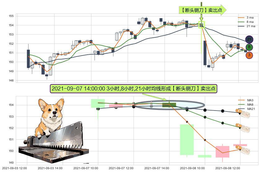 形态多维评估: ⚀ 2021-09-07 14:00:00小时显现 3小时-8小时-21小时均线 【断头铡刀】卖出点 看空信号,后市看跌,卖出