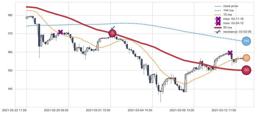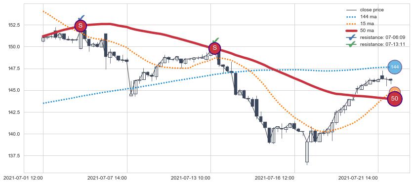 下跌趋势07-01 12:00-07-22 11:00,均线50确认关键阻力2处