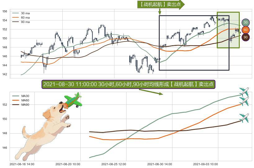 形态多维评估: ⚀ 2021-08-20 14:00:00小时-2021-09-07 14:00:00小时显现 30小时-60小时-90小时均线 【战机起航】卖出点 看空信号,后市看跌,卖出