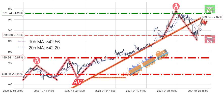♘ 阻力价格位571.24,可信任强度73.29%,距离最后交易2021-01-28 16:00形成的收盘价格547.81相差 +4.28%