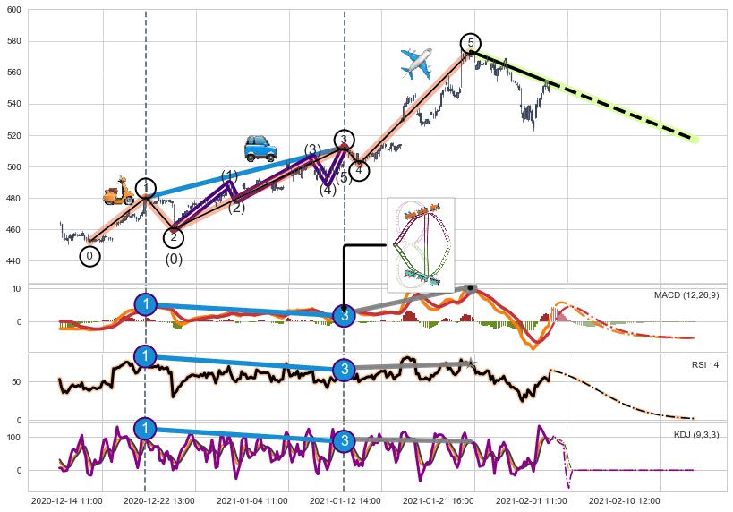 ➣ 1,3,5驱动浪MACD, RSI, KDJ走势都出现【常规背离】反转信号增强