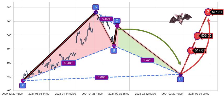 ➢ 距离预测D点位置有足够的下跌空间, 与看涨【蝙蝠】形态相反,实际方向【看跌】