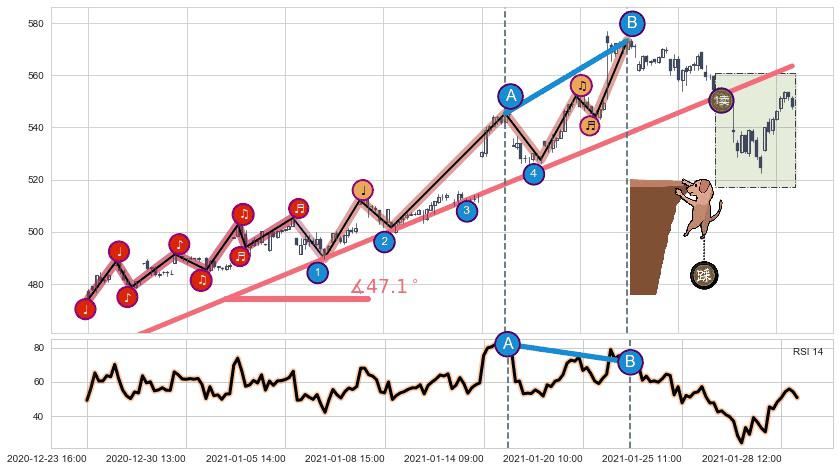 从2020-12-23 16:00至2021-01-21 16:00,共包含140个小时,阶段股价上涨18.96%,阶段股价变动位移路程比: 1 : 3,上涨趋势角度: 47.1