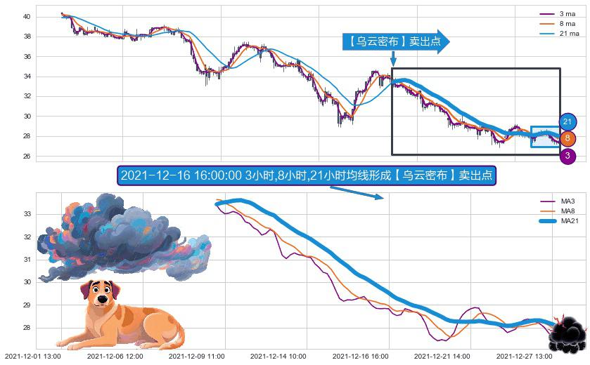 形态多维评估: ⚀ 2021-12-09 09:00:00小时-2021-12-27 15:00:00小时显现 3小时-8小时-21小时均线 【乌云密布】卖出点 看空信号,后市看跌,卖出