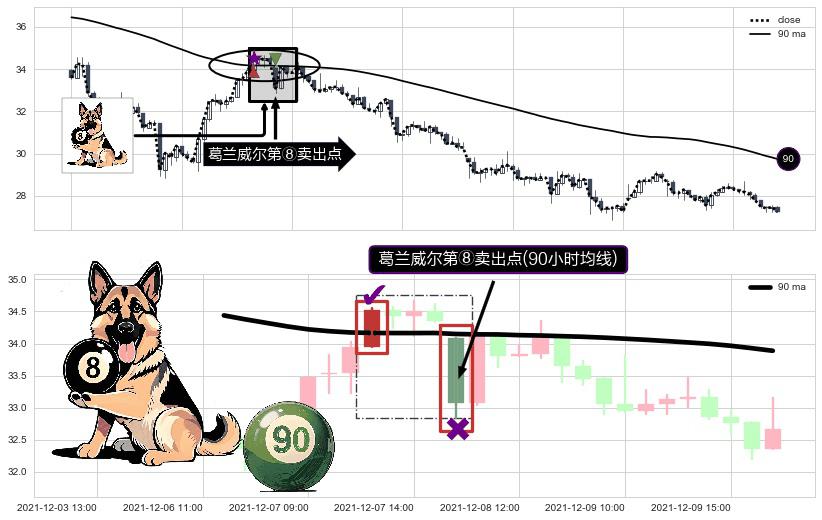 形态多维评估: ⚀ 2021-12-08 09:00:00-小时显现 葛兰威尔均线 90小时均线 第⑧卖出点 下降趋势的中继信号,后市看跌,卖出信号