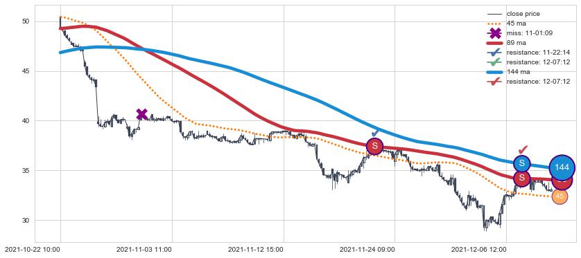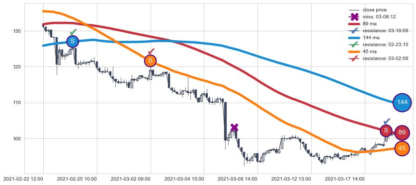 下跌趋势02-22 12:00-03-19 12:00,均线144, 89, 45确认关键阻力3处