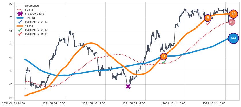上涨趋势08-23 14:00-10-22 10:00,均线144, 45确认关键支撑2处