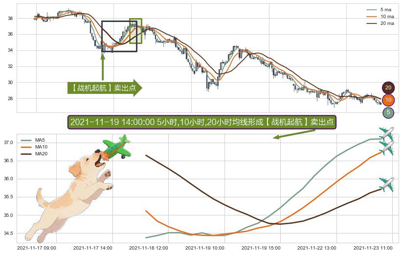 形态多维评估: ⚀ 2021-11-18 10:00:00小时-2021-11-23 10:00:00小时显现 5小时-10小时-20小时均线 【战机起航】卖出点 看空信号,后市看跌,卖出