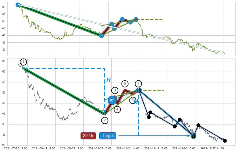 从2021-10-21 10:00至2021-12-27 15:00,共包含309个小时,阶段股价下跌-60.38%,阶段股价变动位移路程比: 1 : 4,下跌趋势角度: 43.7