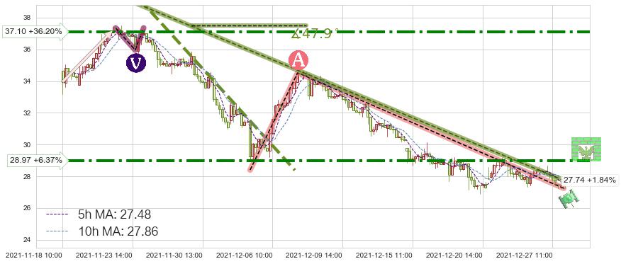 ♘ 阻力价格位37.10,可信任强度74.67%,距离最后交易2021-12-27 15:00形成的收盘价格27.24相差 +36.20%