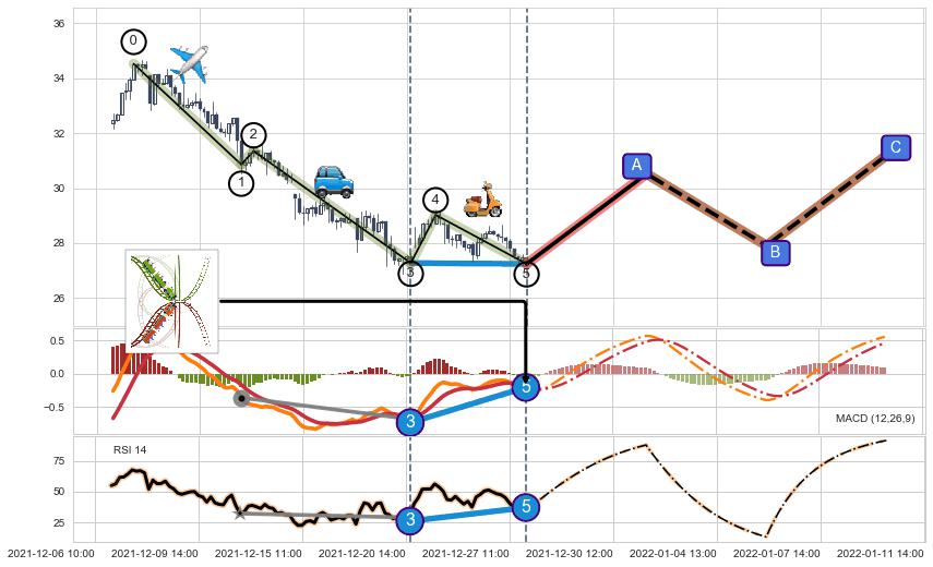 ➣ 第一, 三, 五浪下跌动能逐渐【衰弱变小】,趋势呈现不稳迹象