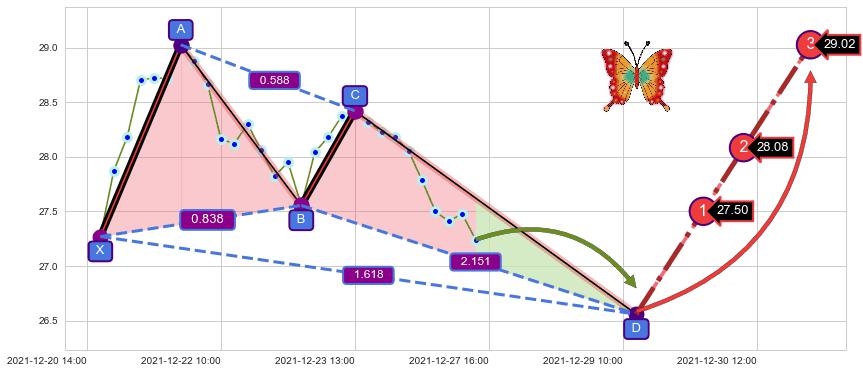 ➣ 未完成【蝴蝶】形态起点X: 12-20:15, 已到达C点: 12-23:13, 预测最终D点: 12-29:11, 共41交易小时