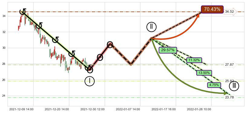 ➣ D点拟合预测价格26.56,距离最后交易收盘价格27.24相差 -2.50%