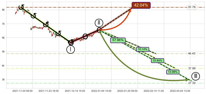 ♘ 支撑价格位57.12,可信任强度62.89%,距离最后交易2021-12-27 16:00形成的收盘价格65.45相差 -12.73%