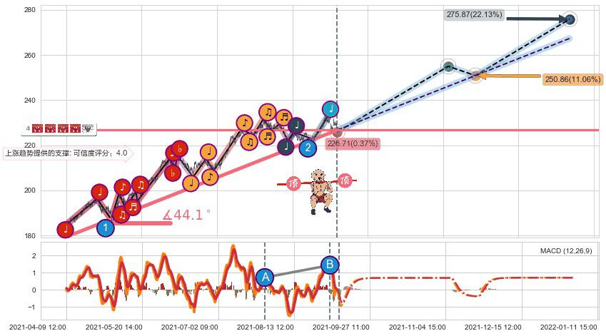 ♘ 在最后的上升阶段2021-04-12 09:00至2021-09-09 13:00存在 破位边缘的支撑位 ,支撑价格226.71,支撑可信任强度86.36%,其距离最后价格225.88相差 +0.37%