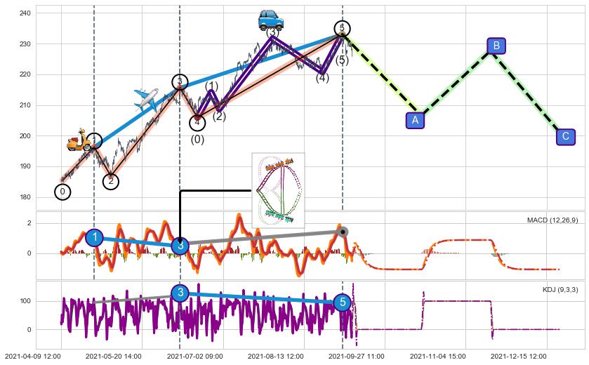 | 9 🅚:【断头铡刀】卖出点 ➕ 🌊:波浪理论猜想上涨浪5已形成,猜想后续形成回调abc下跌(均值回复) ☞ 看空信号 ⇥ 【均线】交织【图形】⇥ 综合量化分数: 14 | > |