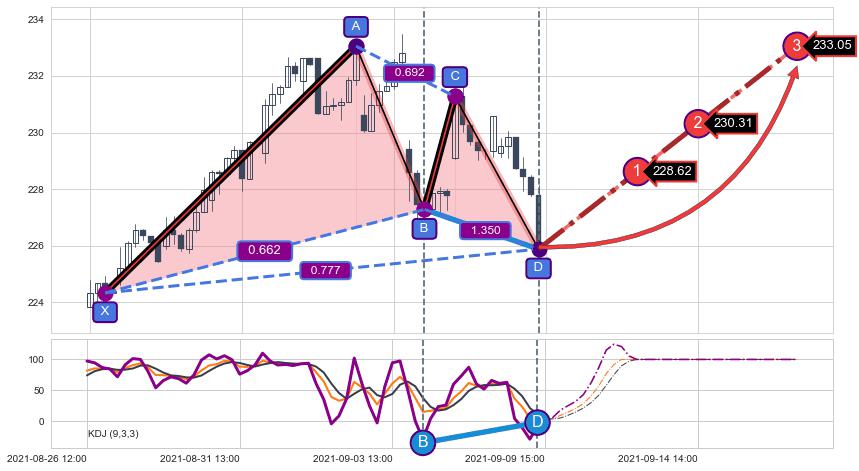 ➣ D点拟合预测价格222.58,距离最后交易收盘价格225.88相差 -1.46%