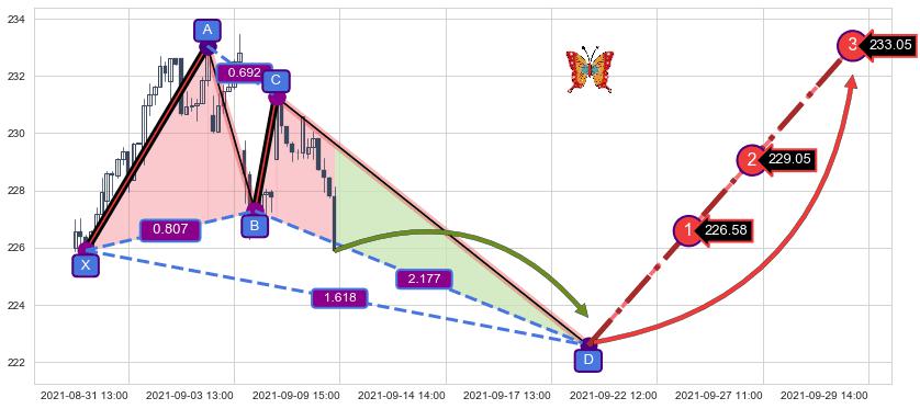 ➢ 距离预测D点位置有足够的下跌空间, 与看涨【蝴蝶】形态相反,实际方向【看跌】
