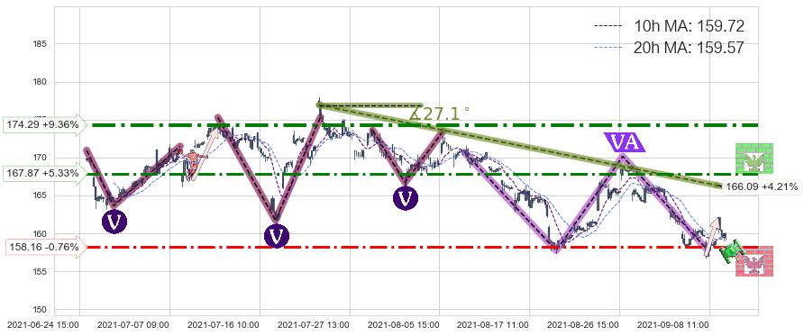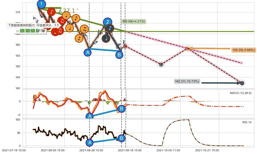 ➣ 预测:2021-10-08 09:00,【试探阻力】稳定目前下跌趋势的前提下,预测价格:158.29