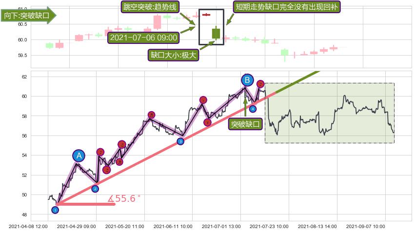 从2021-04-13 12:00至2021-07-19 12:00,共包含456个小时,阶段股价上涨14.39%,阶段股价变动位移路程比: 1 : 8,上涨趋势角度: 55.6,2021-04-30 09:00向⇪形成缺口,跳空上涨+4.92%