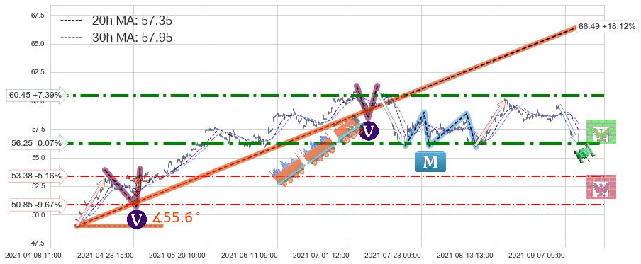 ♘ 阻力价格位56.25,可信任强度85.09%,距离最后交易2021-09-09 14:00形成的收盘价格56.29相差 -0.07%