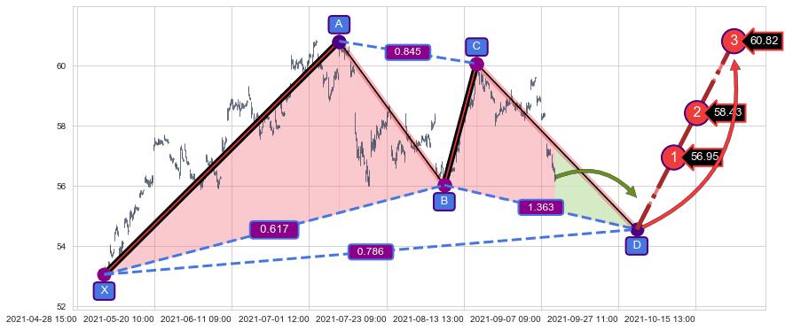 ➣ D点拟合预测价格54.55,距离最后交易收盘价格56.29相差 -3.09%