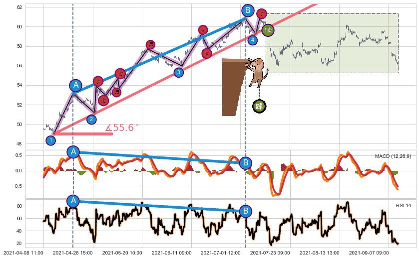 ➢ 最后的上涨趋势2021-04-13 12:00至2021-07-19 12:00:存在破位迹象,后续小调整或者反转下跌