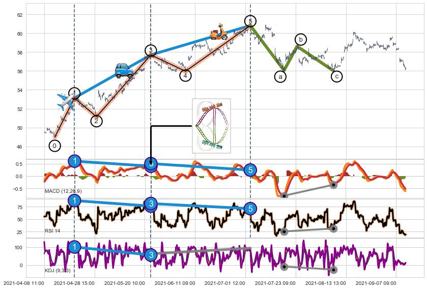 ➣ 1,3,5驱动浪MACD, RSI, KDJ走势都出现【常规背离】反转信号增强
