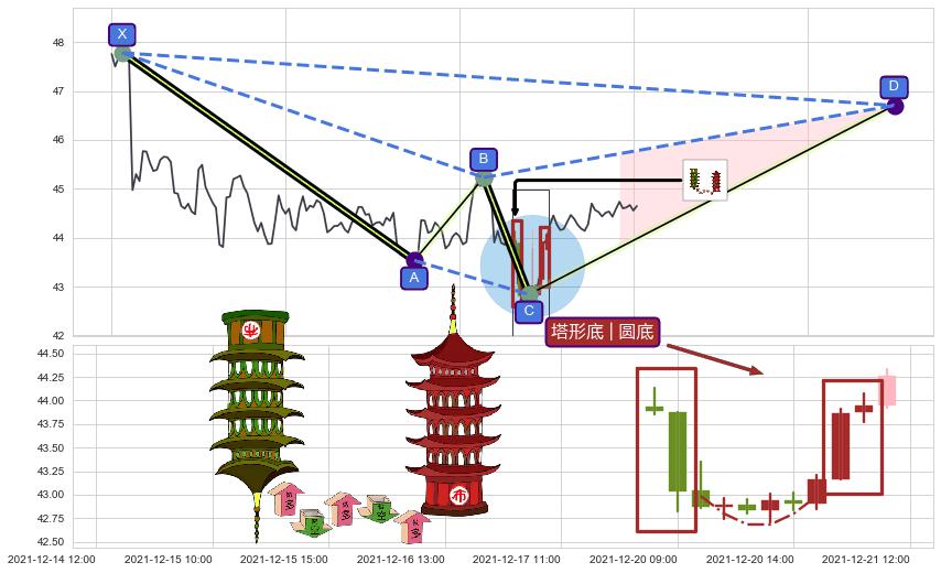 ➣ D点拟合预测价格46.70,距离最后交易收盘价格44.65相差 +4.60%
